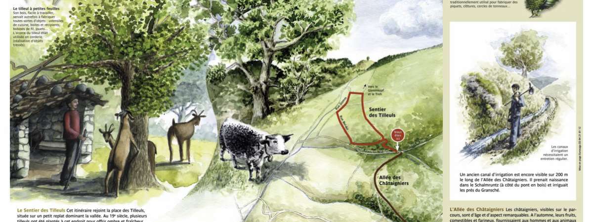 Le sentier des tilleuls traverse d’anciens pâturages et offre de très beaux points de vue sur la vallée de la Thur et sur le village d’Oderen.