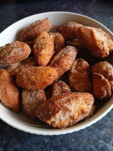 4) Faites chauffer l'huile dans une casserole. Elle doit être à 170°C environ. Mélangez un peu de sucre et de cannelle pour rouler les schenkelas dedans après cuisson. Plongez les schankelas dans l'huile de friture, faites les cuire jusqu'à ce qu'ils soient bien dorés en prenant soin de les retourner de temps en temps. Ils vont se craqueler sur le dessus : c'est normal! Disposez les sur du papier absorbant puis roulez les dans un mélange de sucre et de cannelle.